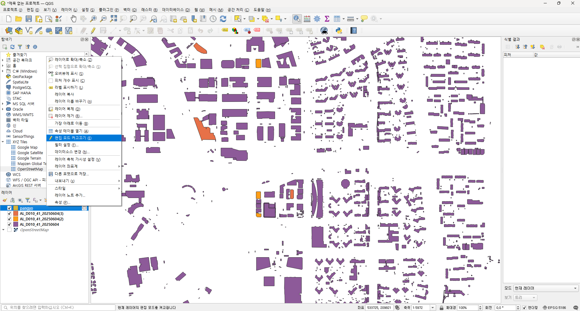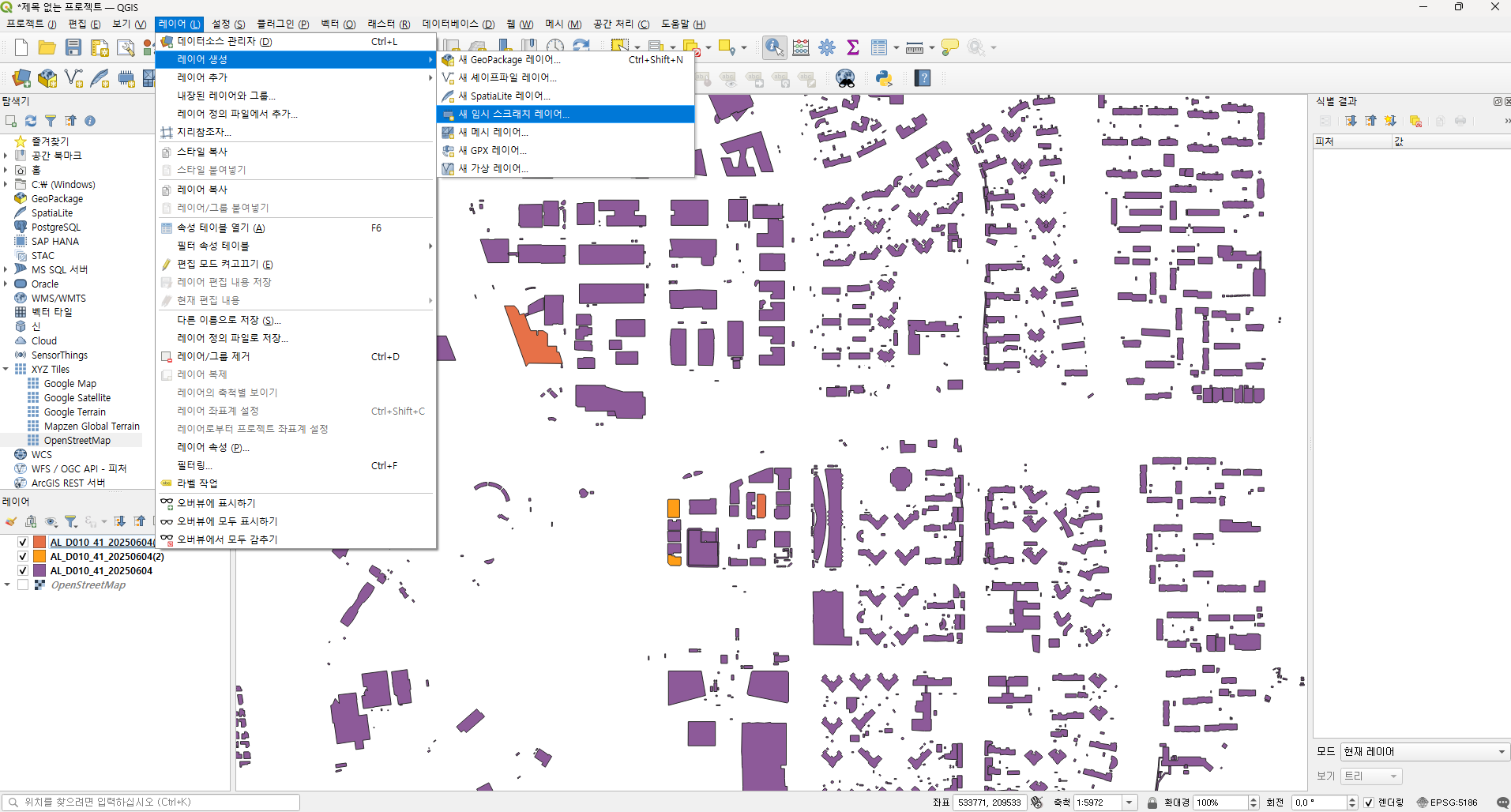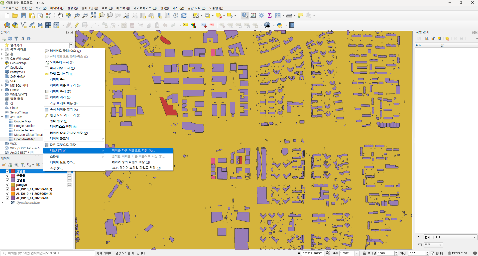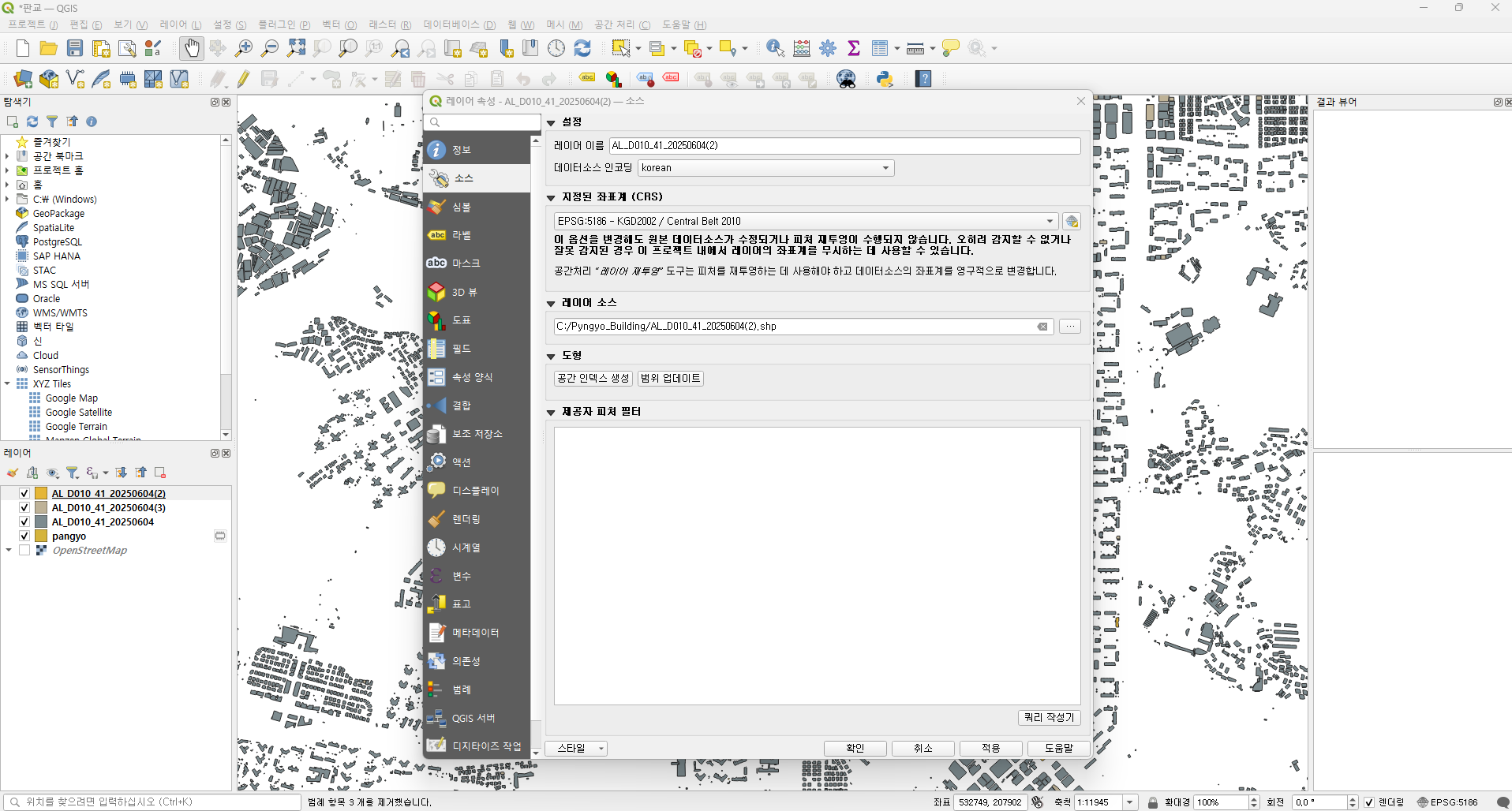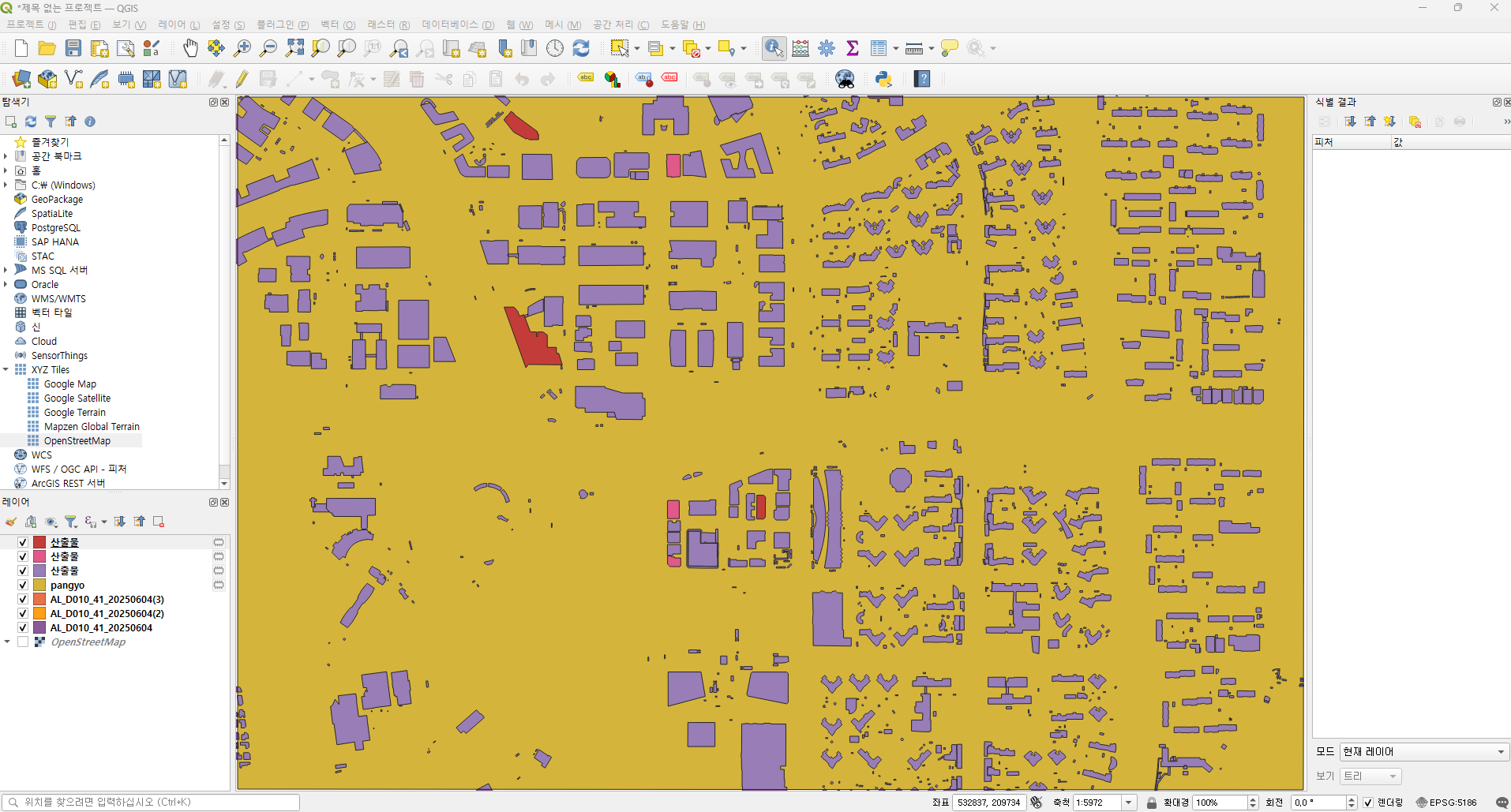 경기도의 경우에는 건물 레이어가 3개 였으니 잘라내기를 3번 실행합니다. 레이어 탭에 산출물이 3개 생성됩니다.