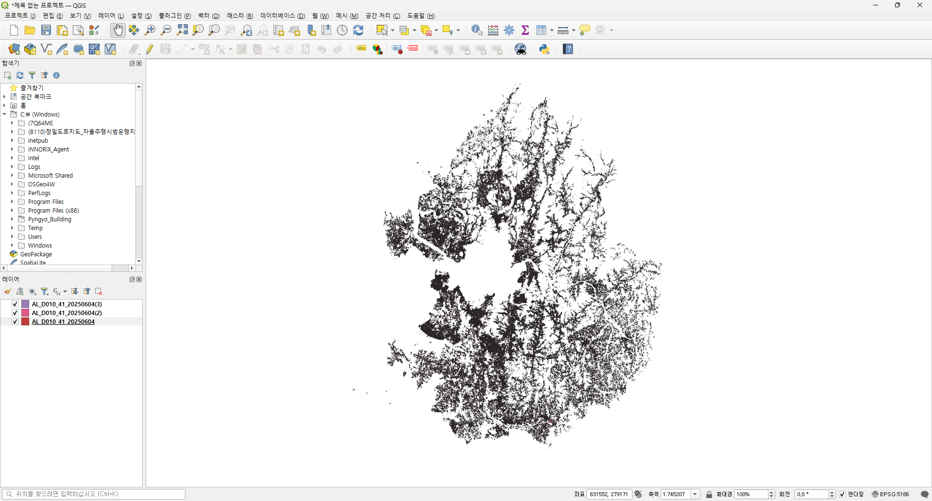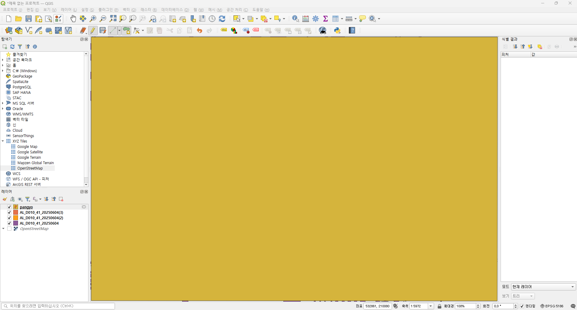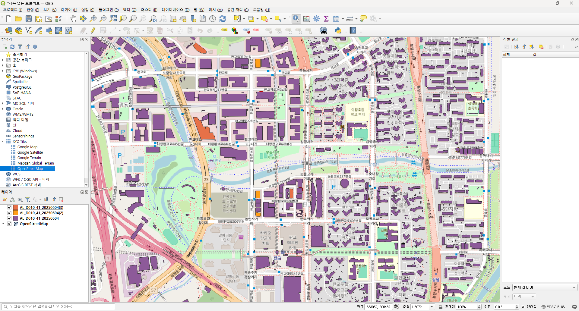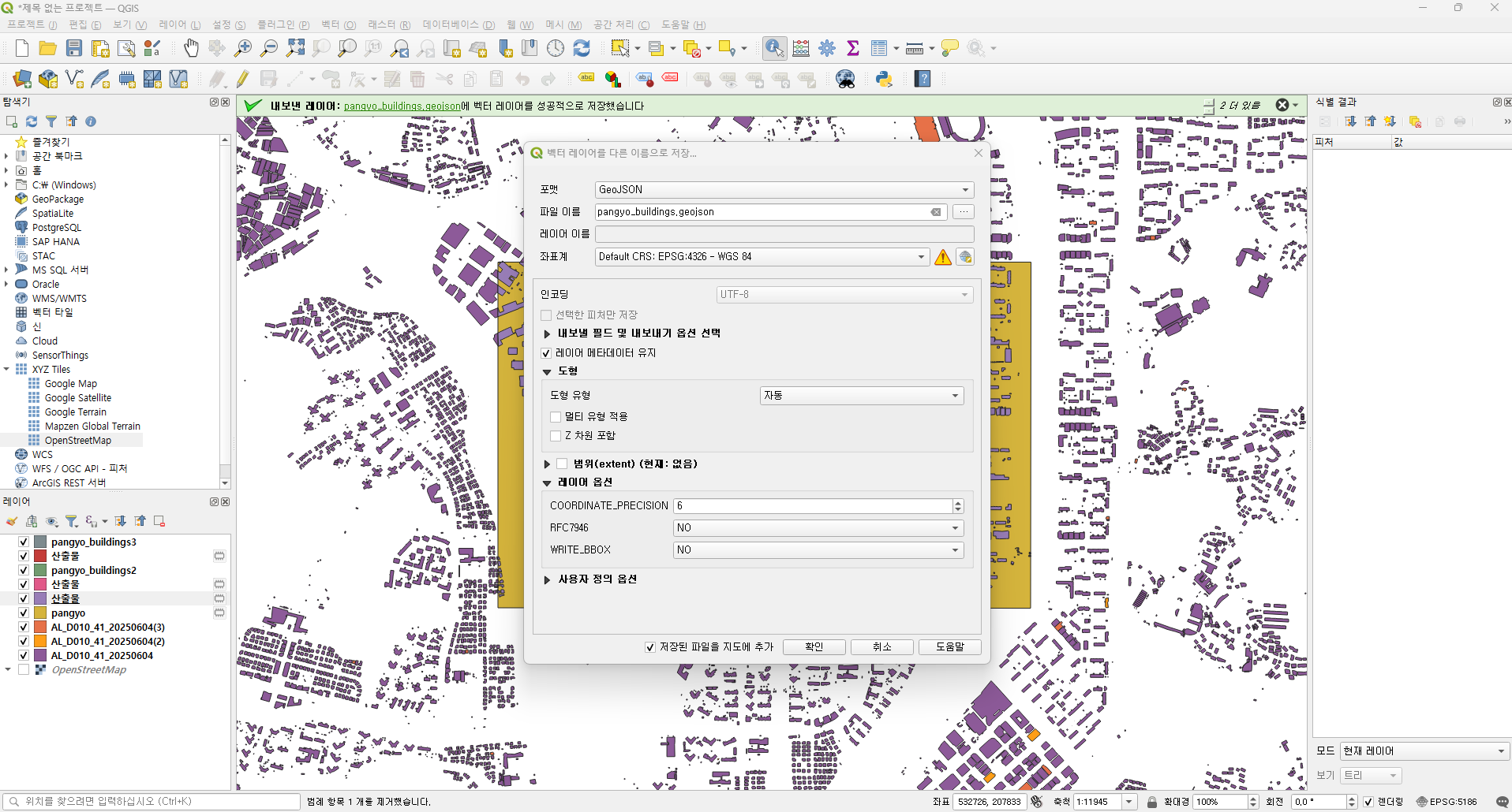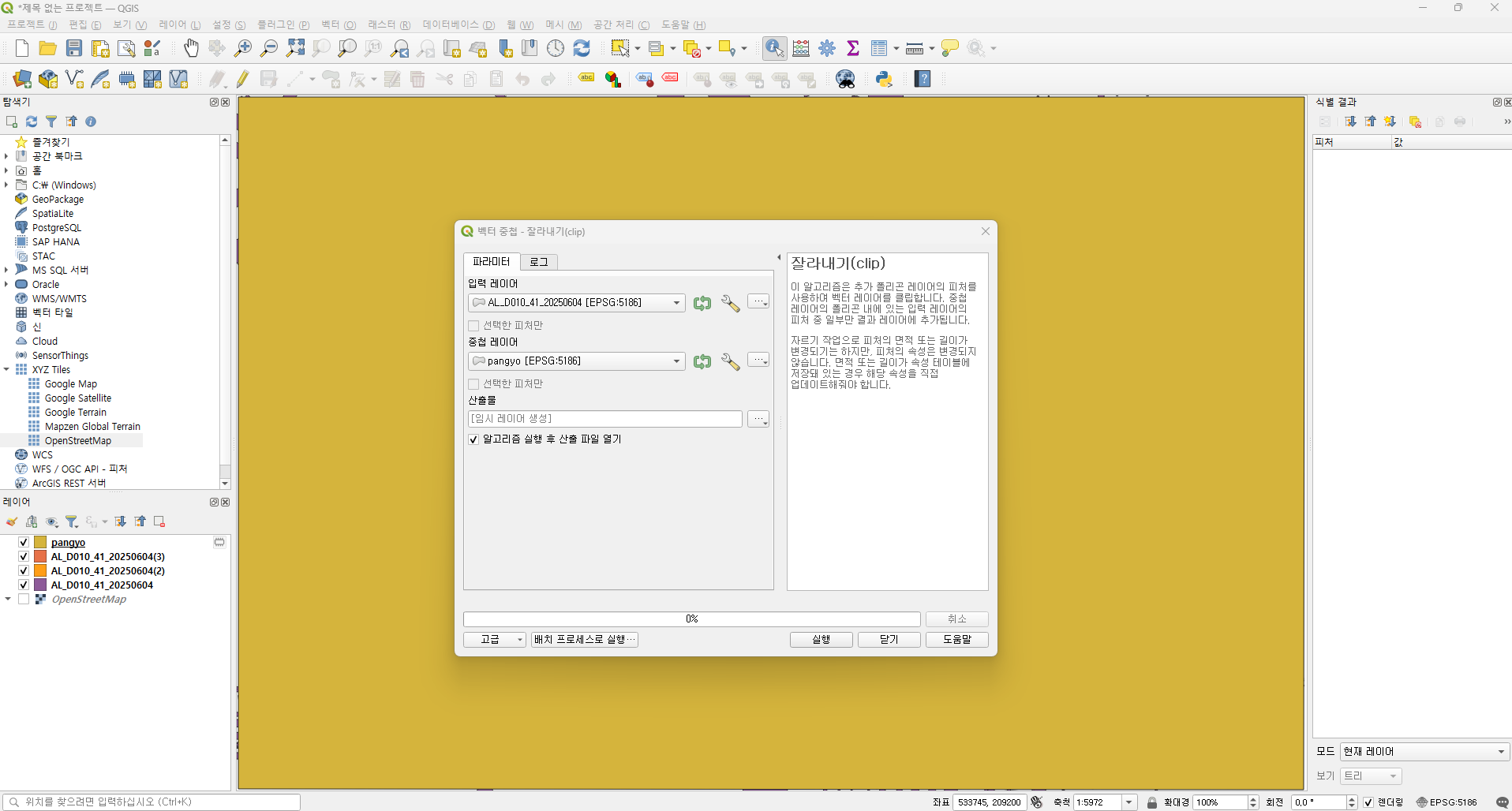 경기도의 경우에는 건물 레이어가 3개 였으니 잘라내기를 3번 실행합니다. 레이어 탭에 산출물이 3개 생성됩니다.