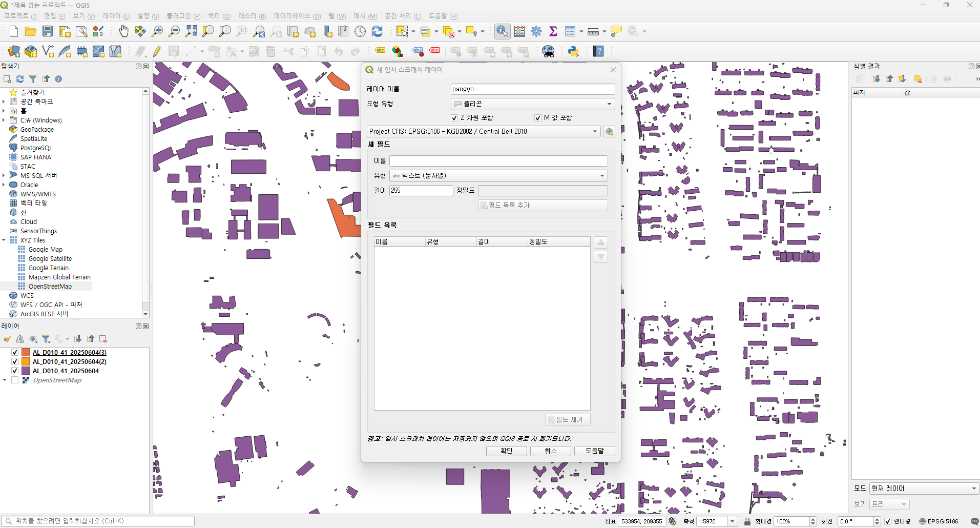 레이어 > 레이어 생성 > 새 임시 스크래치 레이어를 선택하면 새 임시 스크래치 레이어 창이 열립니다. 레이어 이름을 작성하고, 도형 유형을 선택합니다. 좌표계는 프로젝트와 파일과 동일한 좌표계를 선택합니다.