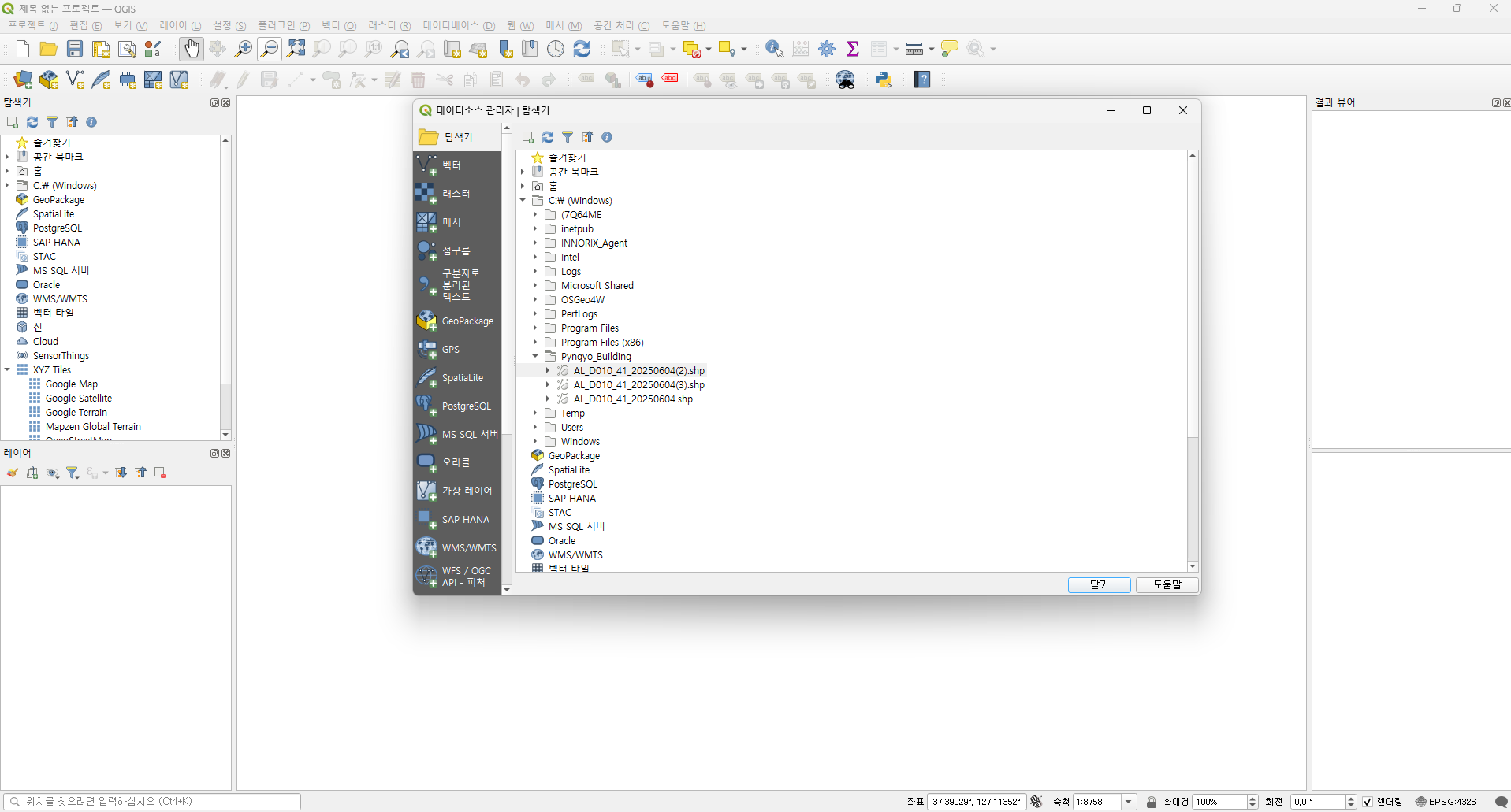 QGIS를 실행합니다. 레이어 > 레이어 추가 > 벡터 레이어 추가 > SHP 파일 선택하면 지도에 전체 건물이 표시됩니다.
