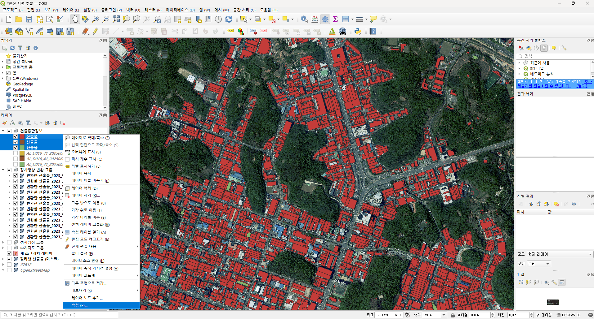 경기도의 경우에는 건물 레이어가 3개 였으니 잘라내기를 3번 실행합니다. 레이어 탭에 산출물이 3개 생성됩니다.