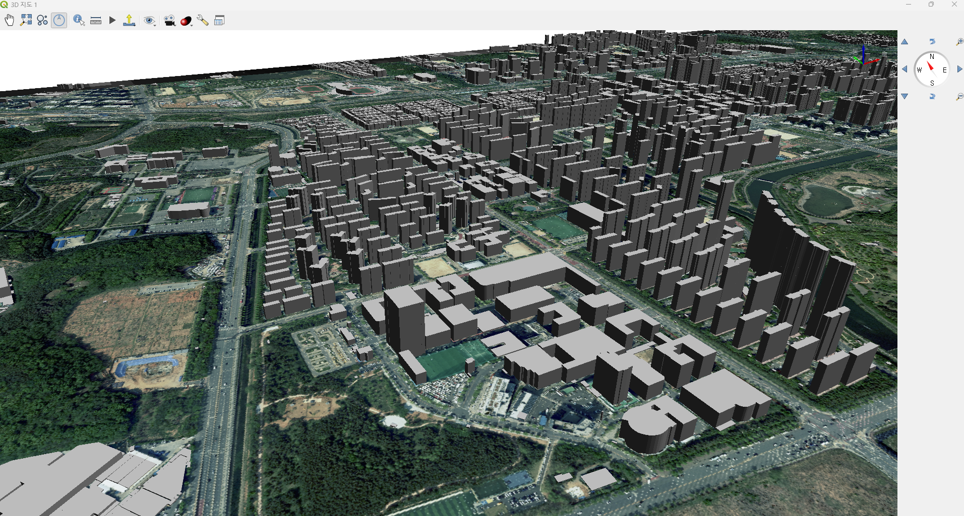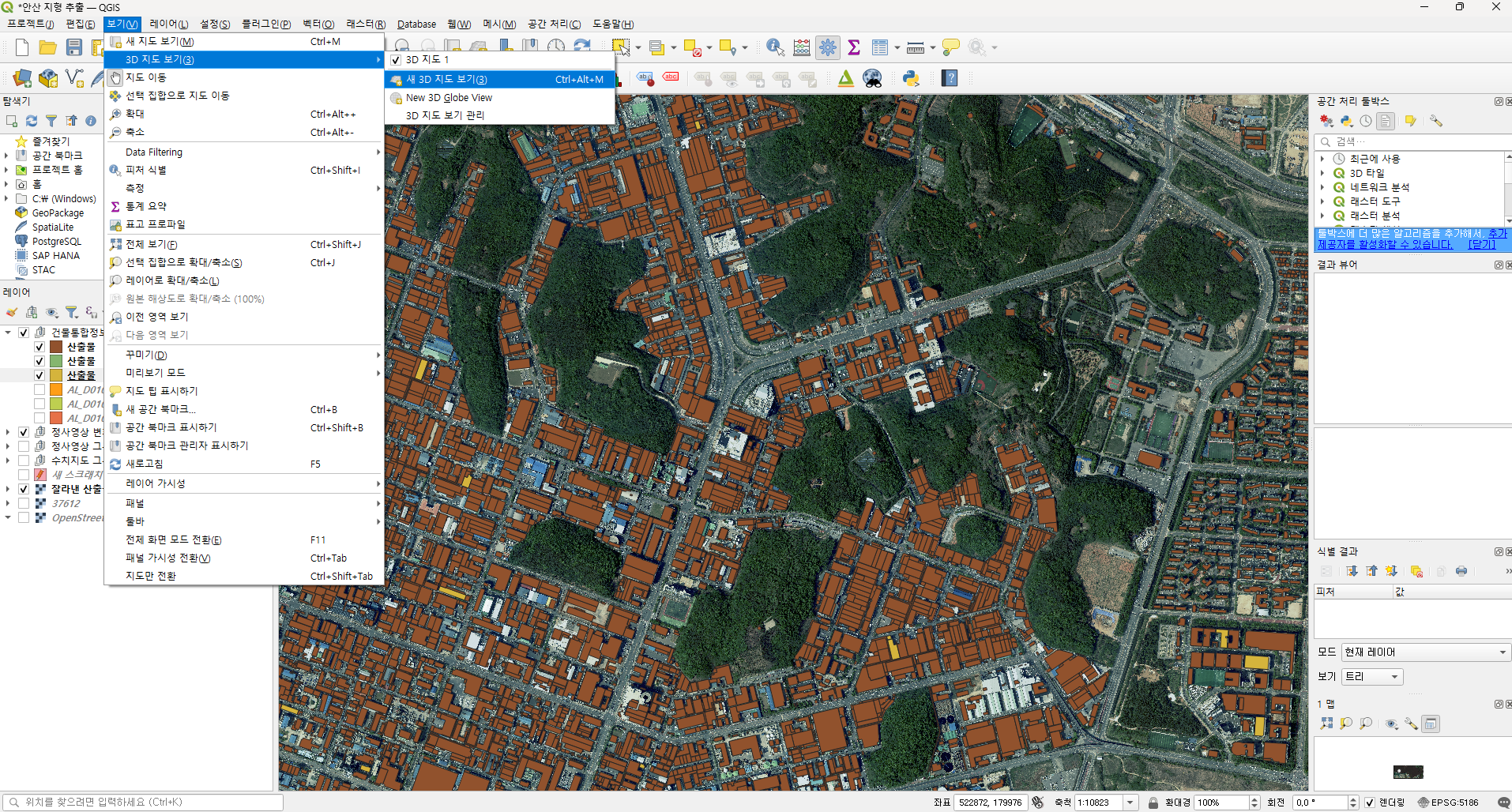 모든 건물 레이어의 3D 뷰 속성을 변경했으면, 상단 탭의 보기 > 3D 지도 보기 에서 정상적으로 높이가 압출되었는지 확인합니다.