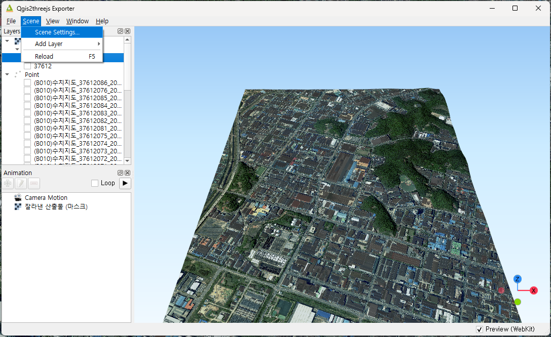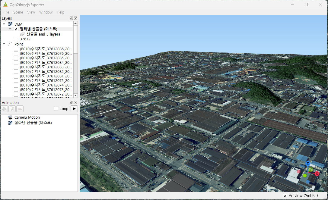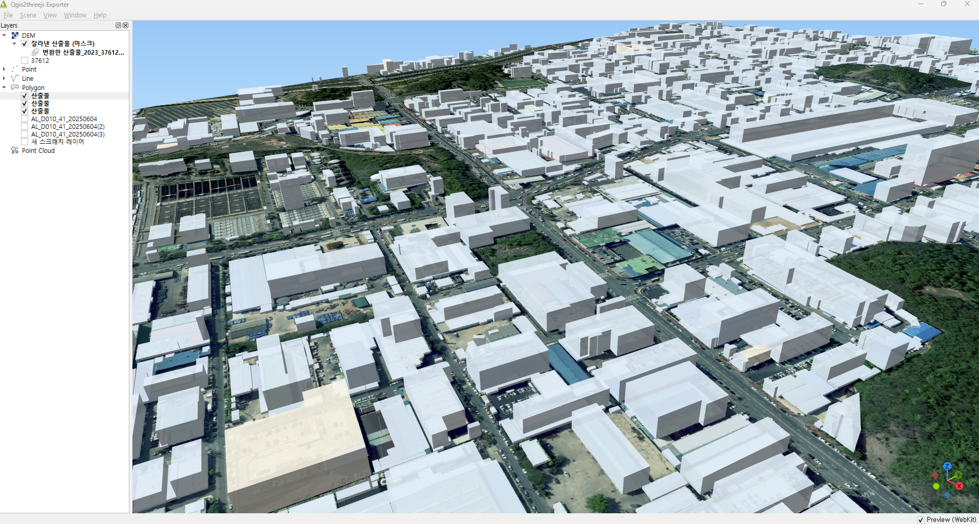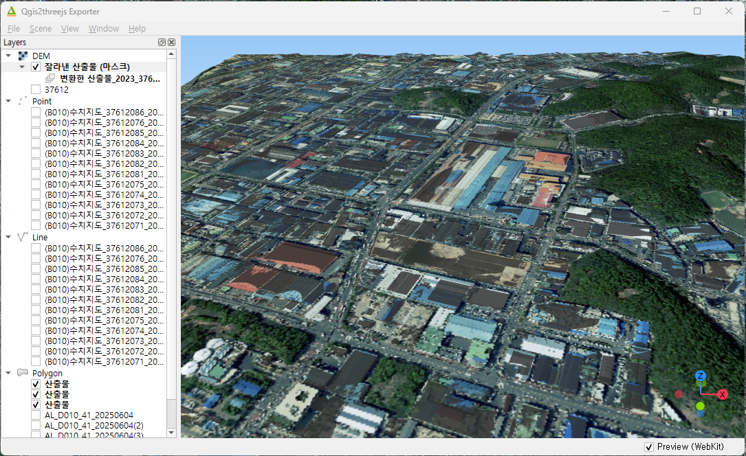 모든 건물 레이어의 높이 설정이 끝나면, Qgis2threejs 창에서 건물들이 깔끔하게 3D 설정이 완료된 것을 볼 수 있습니다. (가시성을 위해 레이어 색상을 바꾸었음)