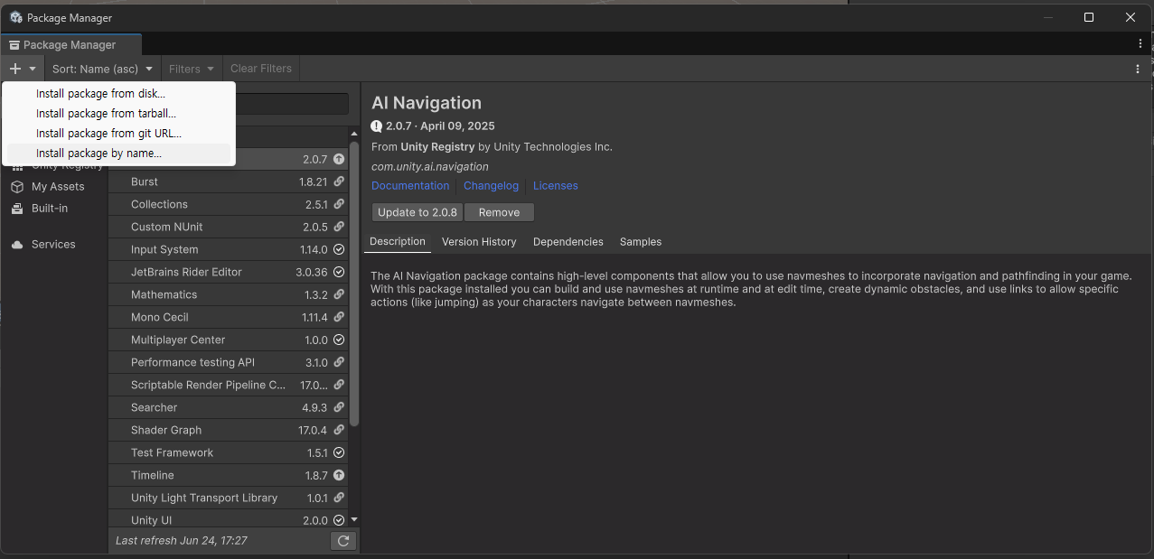 우선 유니티 프로젝트를 열고, 상단 탭에서 Window > Package Manager 를 엽니다. 추가(+) > 패키지 이름으로 설치(install package by name) 를 선택하여 com.unity.cloud gltfast를 설치합니다.