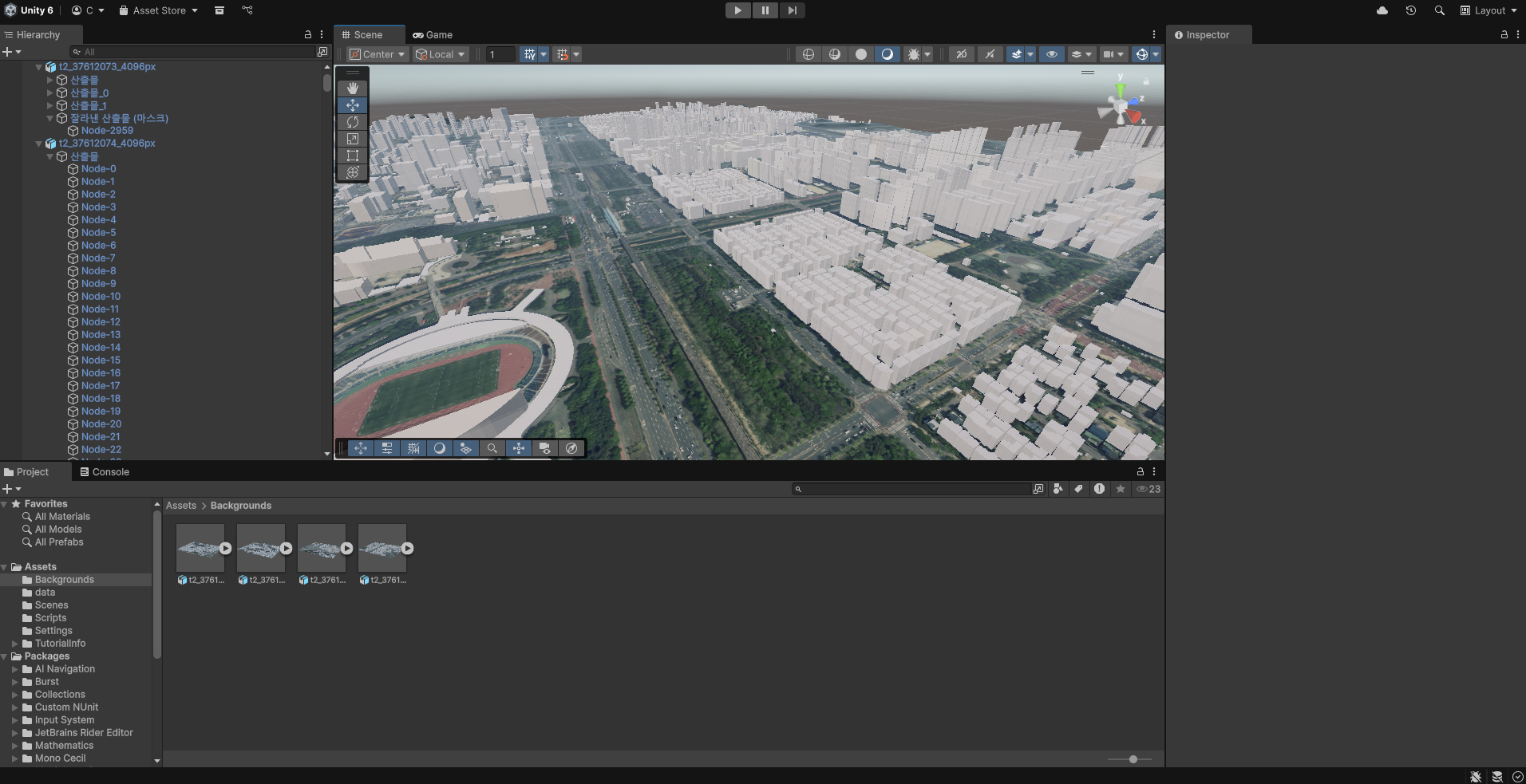 아무리 Qgis2threejs에서 해상도를 높이려 해도, 한정된 데스크탑 성능과 너무 넓은 지형인 까닭에 많은 어려움이 있었습니다. 최종적으로는 해당 지역의 모든 정사영상+건물을 각각 쪼개어 export하여 유니티에 불러오는 방식을 선택하였습니다.