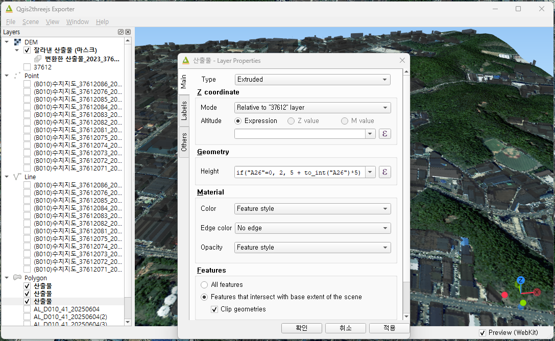 Layers 탭에서 아래로 스크롤을 내리면, Polygon에 잘라낸 건물의 레이어가 있습니다. 건물 레이어를 우클릭하여 Properties 창을 엽니다. Type 과 Z coordinate 설정을 변경합니다. Height는 원하는 높이가 있는 테이블 컬럼이나 원하는 표현식을 적어줍니다.