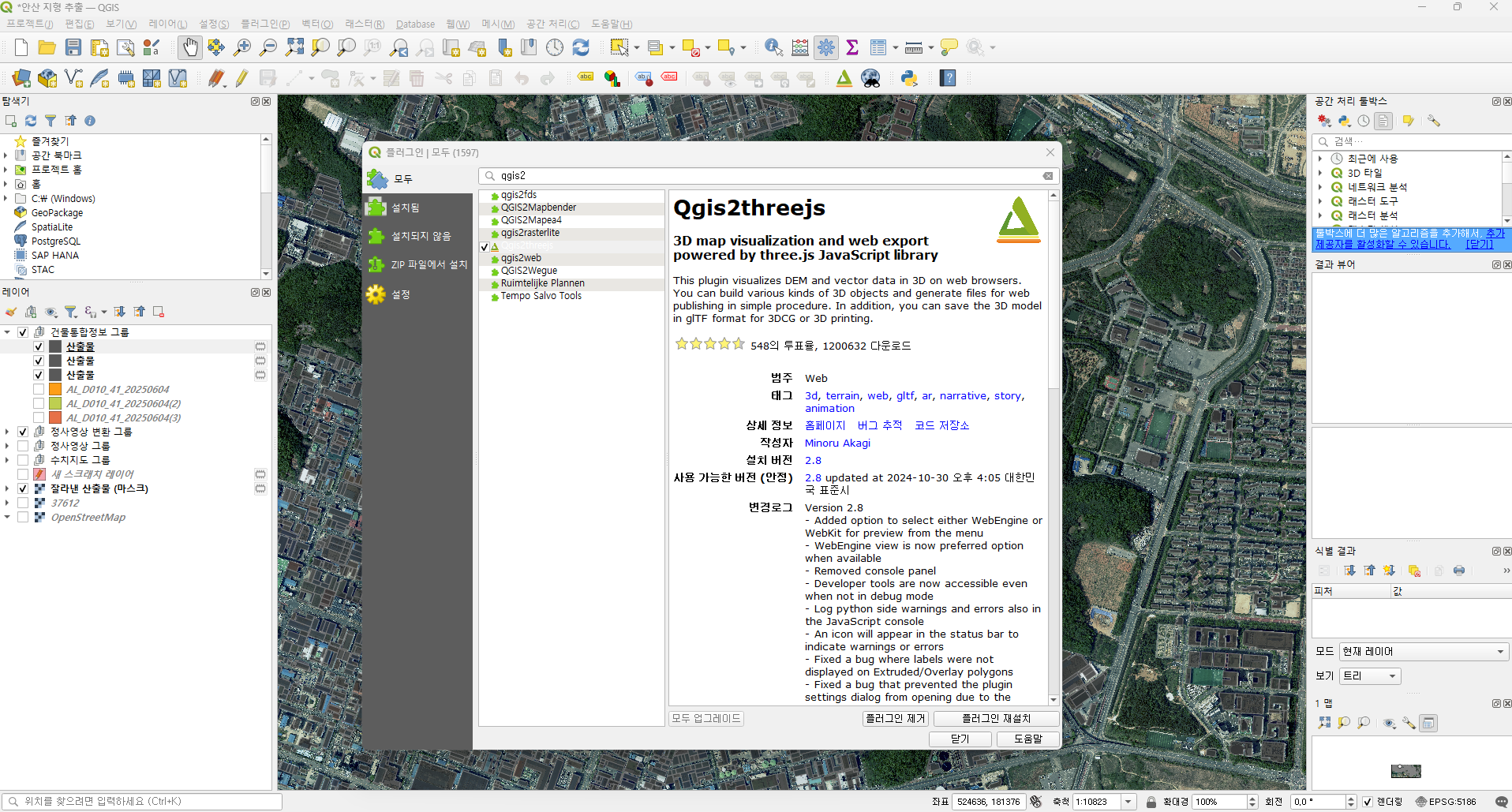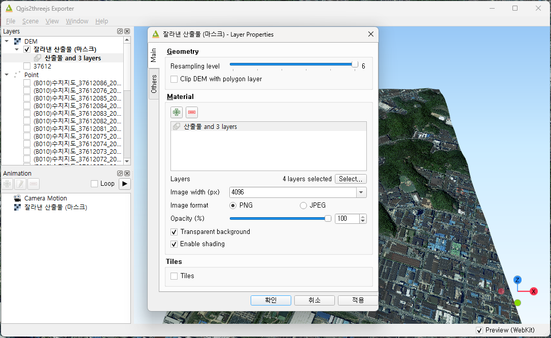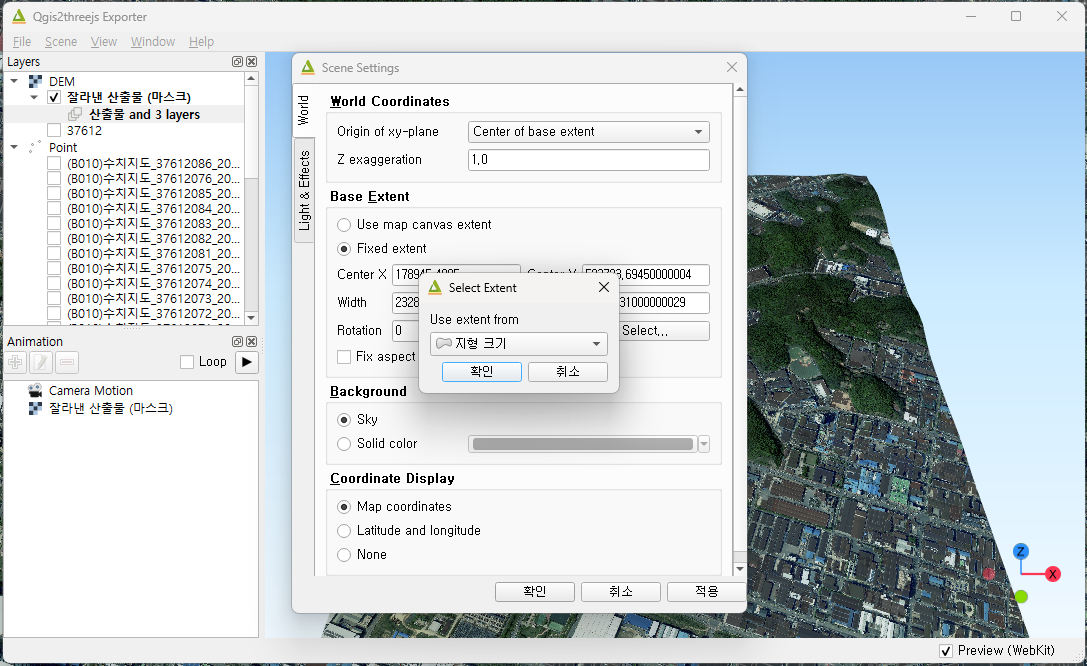 상단 탭의 플러그인 > 플러그인 관리 및 설치 창을 엽니다. 플러그인 창에서 Qgis2threejs을 설치합니다. 설치가 완료되면 상단 탭의 웹 > Qgis2threejs > Qgis2threejs Exporter 를 열고, DEM을 선택합니다.